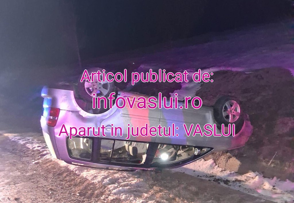Un accident rutier a avut loc în localitatea Pogana, unde un autoturism s-a răsturnat pe cupolă într-un șanț.
