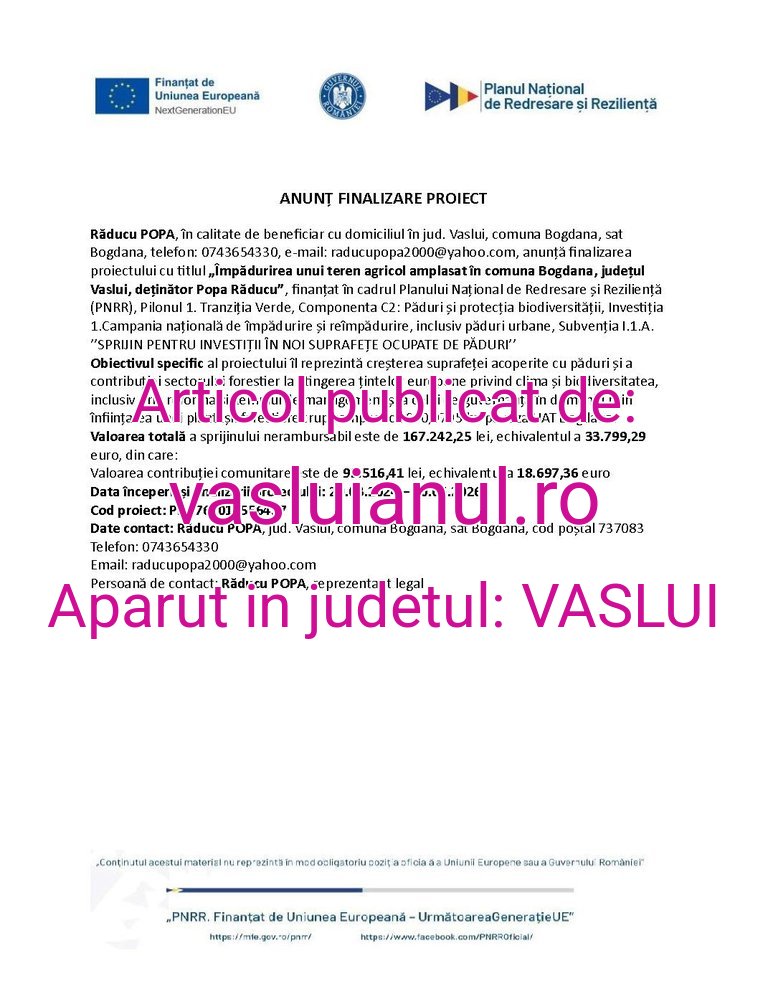 ANUNȚ FINALIZARE PROIECT „Împădurirea unui teren agricol amplasat în comuna Bogdana, județul Vaslui, deținător Popa Răducu” vasluianul 17 octombrie 2025 Acțiune FacebookTwitterPinterestWhatsApp ANUNȚ FINALIZARE PROIECT „Împădurirea unui teren agricol amplasat în comuna Bogdana, județul… Sursa: https://vasluianul.ro/anunt-finalizare-proiect-impadurirea-unui-teren-agricol-amplasat-in-comuna-bogdana-judetul-vaslui-detinator-popa-raducu/ Acțiune FacebookTwitterPinterestWhatsApp Ultimă oră vremea noua Tâlhar cu state vechi, deși are 19 ani: Robert-Mario arestat din nou pentru o tentativă de tâlhărie a unui bătrân de 77 de ani Robo Stiri - 17 octombrie 2025 vremea noua Dramă incredibilă la Vinderei. Doi copii au fost descoperiți înecați, într-o baltă Robo Stiri - 17 octombrie 2025 vremea noua Rubrica șoferilor care au nevoie de „curaj” ca să urce la volan. Numai că s-au ales cu dosare penale Robo Stiri - 17 octombrie 2025 vremea noua Nu o să vă vină să credeți! La Murgeni, o concubină își snopește în bătăie iubitul, pe care-l și înjunghie Robo Stiri - 17 octombrie 2025 Același autor vasluianul ANUNȚ FINALIZARE PROIECT „Împădurirea unui teren agricol din judetul Vaslui, titular Popa Roxana-Isabela” 17 octombrie 2025 vasluianul ANUNȚ FINALIZARE PROIECT „Împădurirea suprafeței de 13000 mp teren amplasat în extravilanul comunei Bogdana, județul Vaslui”, 17 octombrie 2025 vasluianul La miez de noapte, a fost dat jos de la volan de Poliția Rutieră Negrești 16 octombrie 2025 vasluianul Retailerul Penny deschide un nou magazin în Huși 16 octombrie 2025