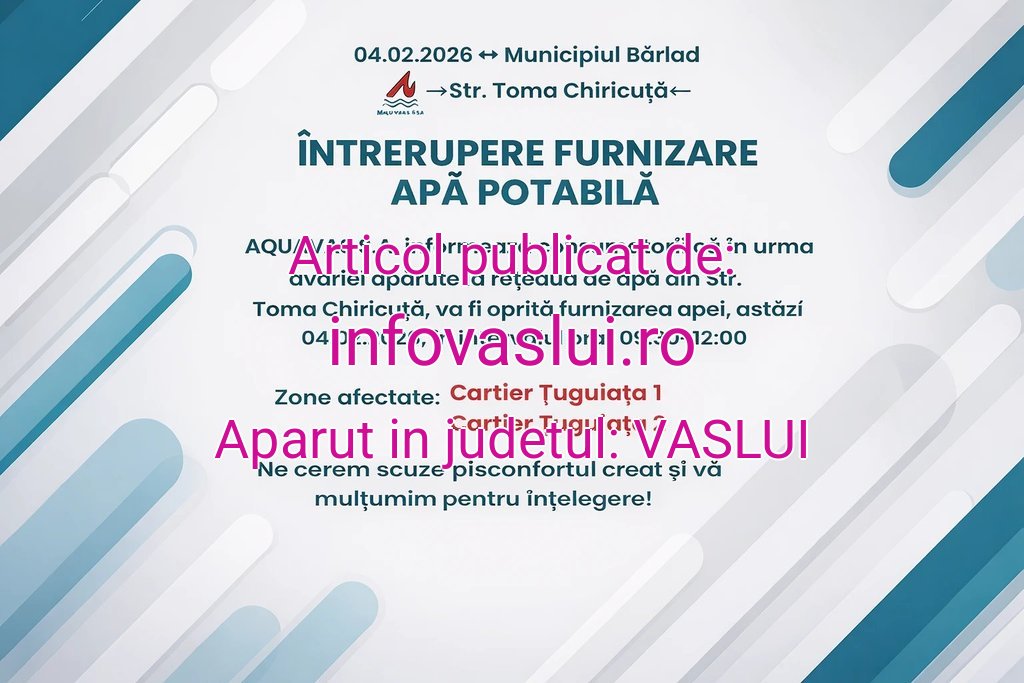 Locuitorii din două cartiere ale municipiului Bârlad vor rămâne temporar fără apă potabilă în cursul zilei de astăzi, 4 februarie 2026, ca urmare a unei avarii apărute la rețeaua de distribuție. Anunțul a fost transmis de operatorul de apă Aquavas S.A.