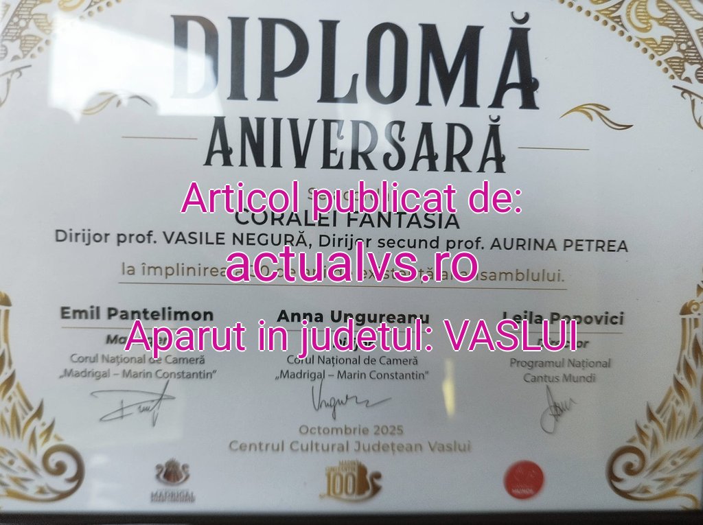 Un moment de mare emoție și recunoaștere pentru muzica corală vasluiană: Corul Național de Cameră „Madrigal – Marin Constantin”, considerat cel mai prestigios ansamblu coral din România și unul dintre cele mai apreciate din lume, a transmis felicitări coralei „Fantasia” din Vaslui, cu prilejul aniversării a 30 de ani de activitate artistică.