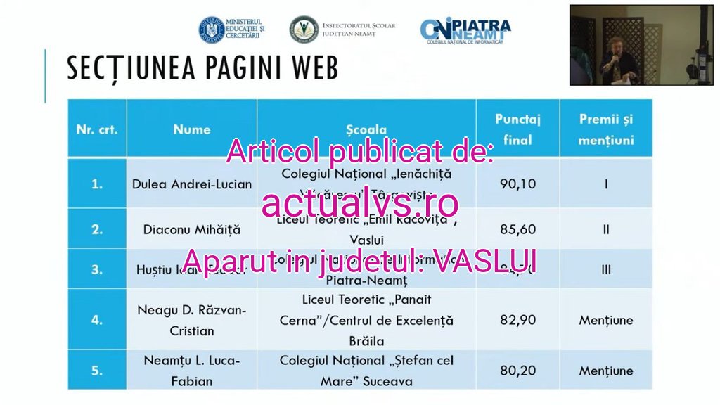 De asemenea, la secțiunea pagini web, elevul Diaconu Mihăiță, din clasa a XI-a, de la Liceul Teoretic „Emil Racoviță” Vaslui, coordonat de profesoara Camelia Popica, a obținut Premiul al II-lea la proba de soft educațional/pagini web.