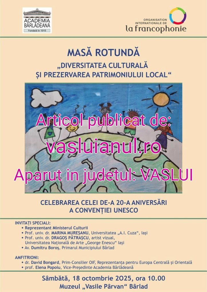 Evenimentul are loc, 18 octombrie a.c., începând cu ora 10, la Muzeul „Vasile Pârvan ” și face parte din proiectulconsacrat celei de-a 20-a aniversări a Convenției UNESCO privind prezervarea și promovarea diversității culturale.