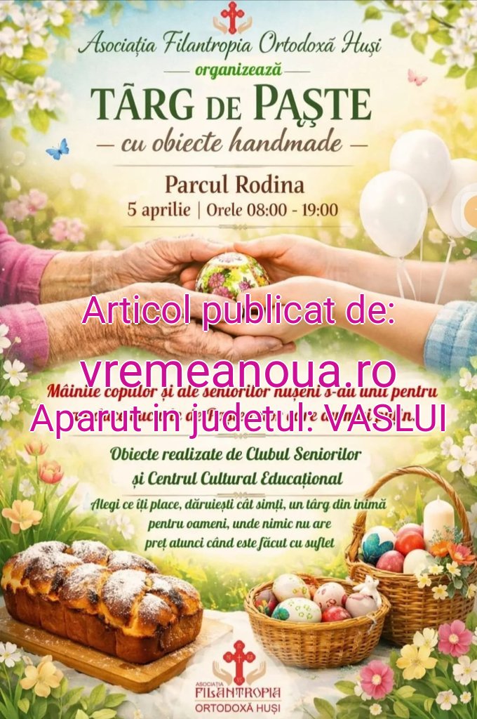 Duminică, 5 aprilie, în Parcul Rodina din municipiul Huși va fi Târgul de Paște, cu obiecte handmade. Copiii și seniorii din cadrul Asociației Filantropia Ortodoxă Huși și-au pus tot sufletul și toată creativitatea în obiectele pe care le-au realizat cu mâinile lor. Ce bucurie va fi pentru fiecare dintre ei, când vor vedea că vin mulți localnici la Târgul lor de Paște, vor admira standul cu produse și, mai mult decât atât, își vor alege obiectele preferatele. Fiecare lucru expus poate fi cumpărat în schimbul unei donații, care va ajuta negreșit un copil sau un bunic ce are cu adevărat nevoie de sprijin. De altfel, hușenii au dovedit întotdeauna sensibilitate, empatie și apreciere pentru acțiunile caritabile, de aceea numărul participanților s-ar putea să fie unul foarte mare. Vremea, după cum arată prognoza meteo, se anunță a fi una cu adevărat frumoasă. Vor fi până la 15 grade Celsius și nu va ploua deloc, spun meteorologii. Cu atât mai interesant va fi, cu cât sunt pregătite multe alte surprize pentru duminică, în parcul Rodina. Este important de precizat că Târgul de Paște de la Huși va deschis duminică, 5 aprilie, între orele 08.00 și 19.00.