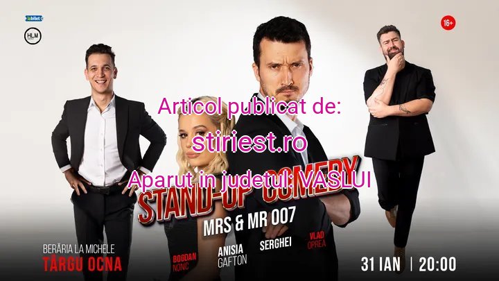 Două orașe din județul Bacău intră, la final de ianuarie și început de februarie, pe harta turneului de stand-up comedy „Mr. & Mrs. 007”. Protagoniștii serilor de umor sunt Anisia Gafton și Serghei, alături de Nonic și Oprea, într-un format de spectacol construit pe ritm alert și interacțiune cu publicul. Prima reprezentație este programată sâmbătă, 31 ianuarie, la Berăria La Michele din Târgu Ocna. Spectacolul începe la ora 20:00, iar accesul publicului se face de la 19:00. Turneul continuă duminică, 1 februarie, la Berăria Valhalla din Bacău, cu același program: acces de la 19:00, start spectacol la 20:00. Organizatorii anunță că locurile sunt limitate, iar biletele sunt disponibile online pe platforma iabilet. Show-ul „Mr. & Mrs. 007” se înscrie în seria evenimentelor de stand-up care au atras constant public numeros în orașele din regiune, mizând pe un stil direct și pe teme inspirate din viața de zi cu zi.