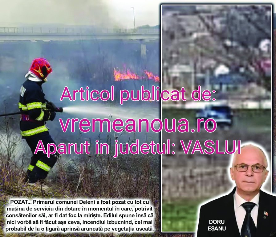 PROBLEME… Judetul Vaslui trece, în aceastã perioadã, prin sezonul incendiilor de miriste, pompierii fiind nevoiti aproape zilnic sã actioneze pe teren pentru a opri flãcãrile sã se extindã si asupra locuintelor. Din cauza pericolului care pândeste dupã fiecare incendiu, Unitãtile Administrativ Teritoriale fac apeluri repetate la populatie sã nu mai aprindã câmpurile, însã în comuna Deleni, situatia se prezintã putin altfel. Marti, mai multi cetãteni l-ar fi vãzut chiar pe primarul Doru Esanu incendiind intentionat miristea, iar pentru avea dovezi i-au pozat masina de serviciu în locul de unde a pornit focul. Oamenii spun cã nu e pentru prima datã când edilul ar fi dat foc vegetatiei uscate, însã de fiecare datã a scãpat neamendat si datoritã functiei pe care o ocupã, dar si a trecutului sãu profesional în cadrul ISU Vaslui. Contactat telefonic, Doru Esanu a declarat cã nu a aprins niciun pai de chibrit, focul extinzându-se, cel mai probabil de la un o tigarã aprinsã aruncatã de un sofer pe marginea drumului.