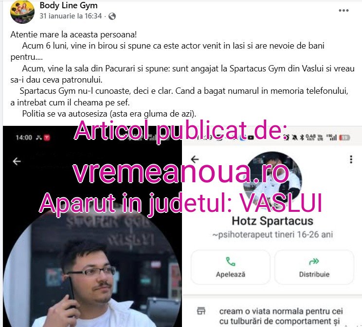 Simtind-se pãcãlit, administratorul sãlii de fitness Body Line Gym Iasi a scris pe Facebook: „Atentie mare la aceastã persoanã! Acum 6 luni, vine în birou si spune cã este actor venit în Iasi si are nevoie de bani pentru…. Acum, vine la sala din Pãcurari si spune: